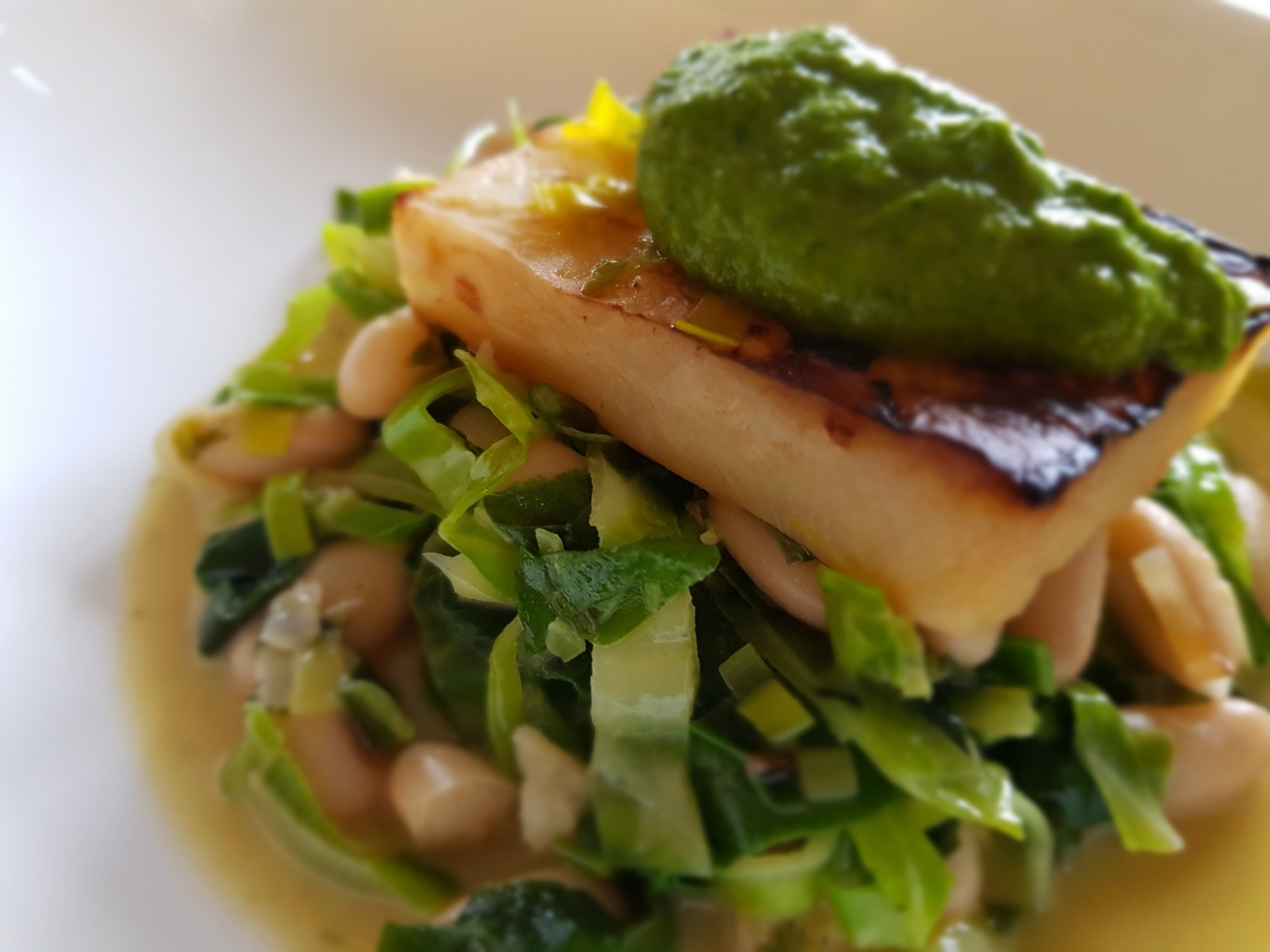 Celeriac fondant on a bed of greens and beans topped with salsa verde