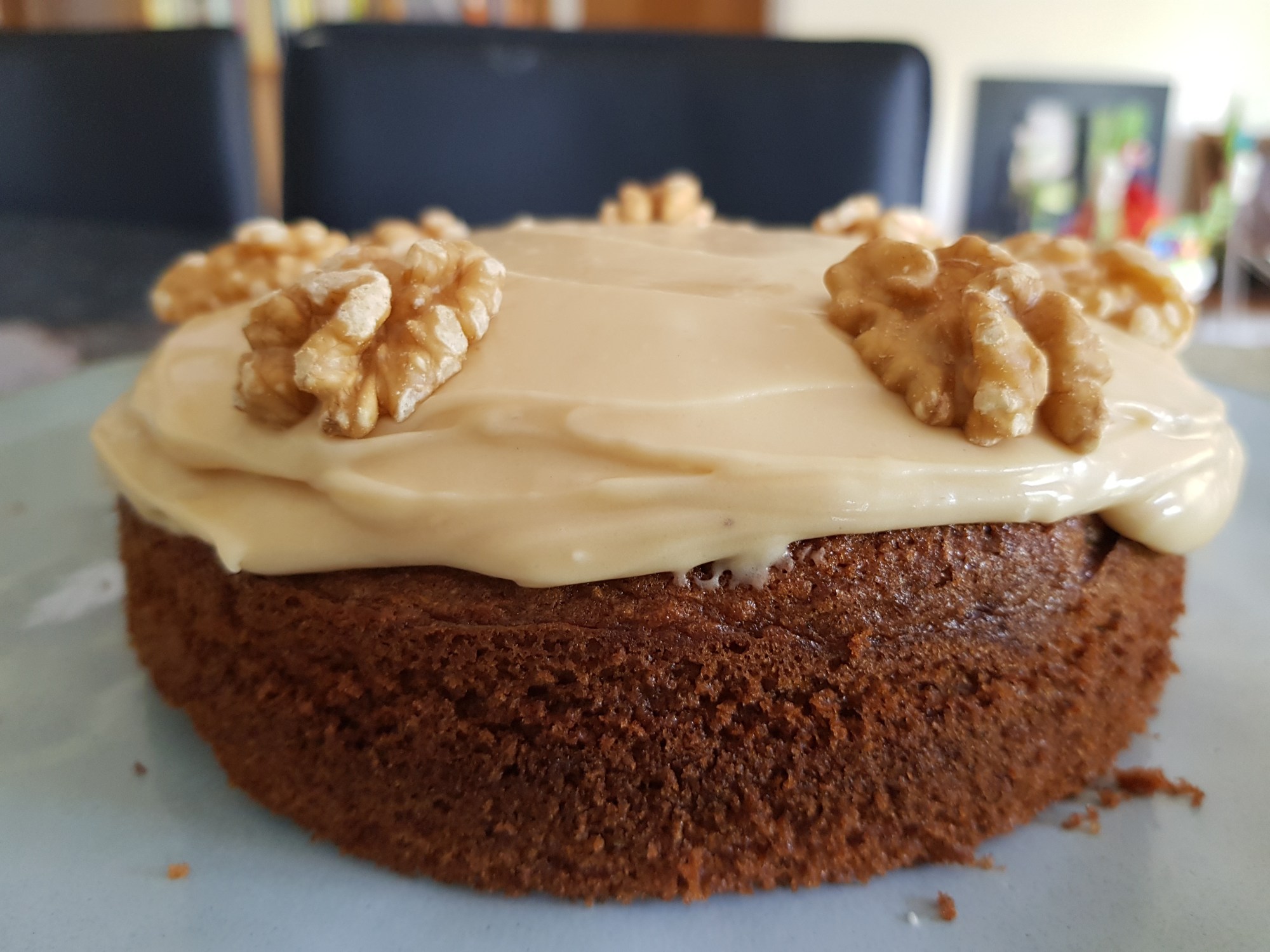 The recipe below is for just under half the recipe to fit a 6 inch pan to make a single layer cake. The frosting is the same I made for the carrot cake but with added coffee granules.