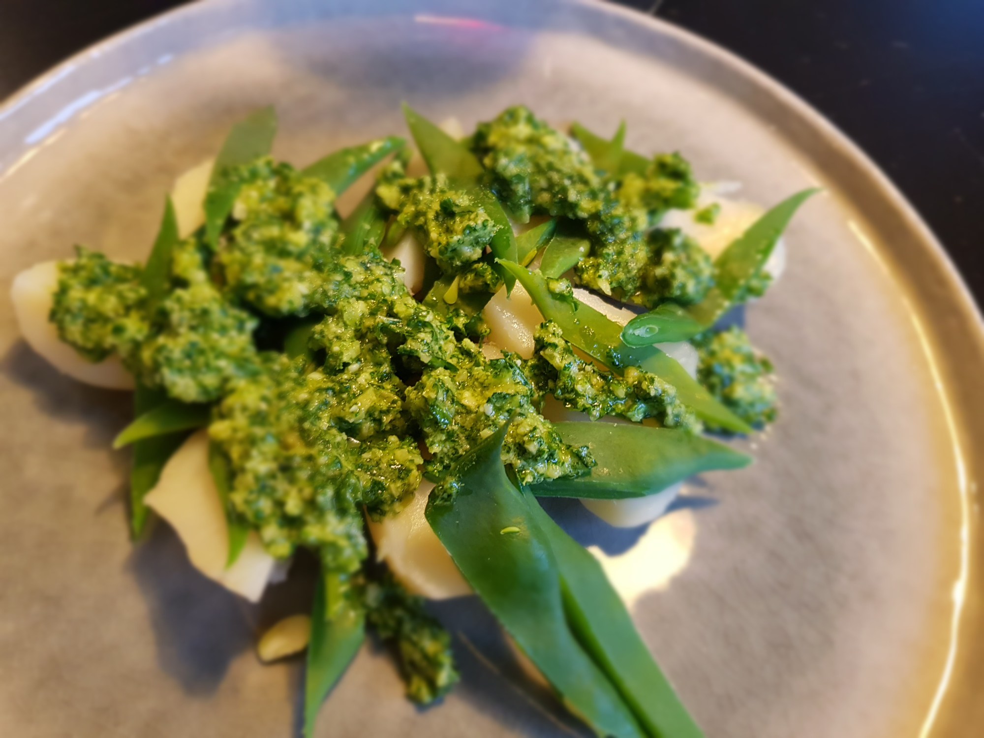 This is my take today using kale and almonds instead of basil and pine nuts in the pesto. The pesto is dolloped onto freshly steamed runner beans and new potatoes, super delicious and a lovely light dinner with a glass of red wine.
