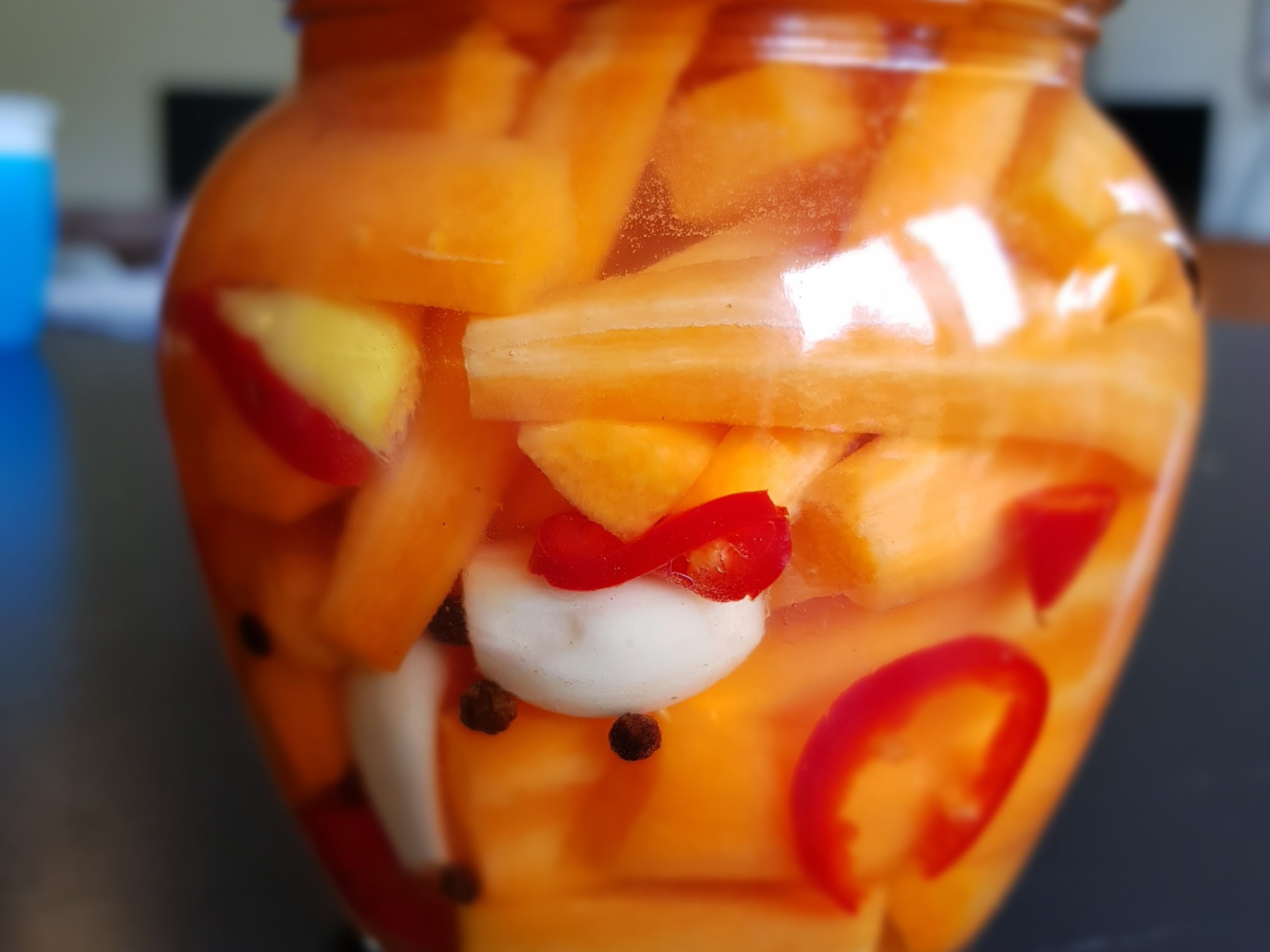 Put the jar on the scale and zero the scale. Add your cut vegetables, garlic, spices to the jar until it reaches the top then pour in your water until it covers the vegetables. Note the total combined weight and work out what 2% is. You will add this number grams of salt into the jar to start the fermentation process. (My water and veg weight was 540g so 2% was 10.8) I added 10.8g of salt into the jar. Push the vegetables down a little bit, close the jar tightly and shake a little to let the salt water distribute evenly. Then leave on your kitchen counter or somewhere at room temperature for 2-4 weeks.
