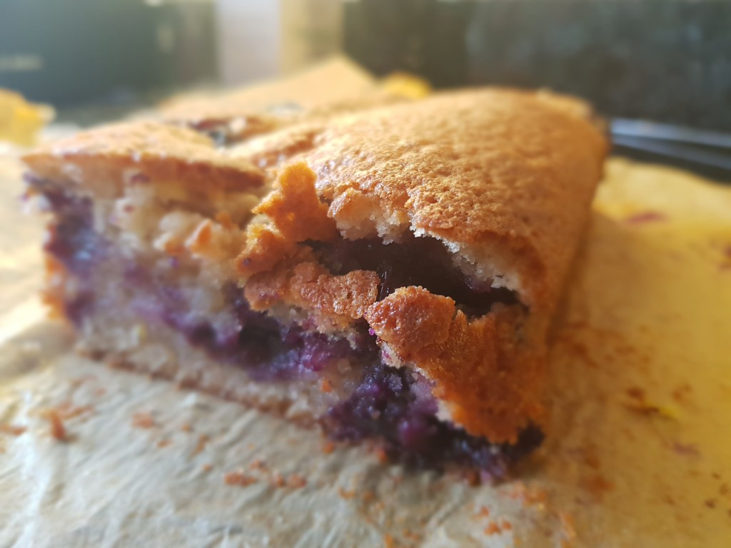 The exciting things are the moistness of the crumb and fruity, zesty taste (it actually tastes of blueberries and lemons!) The other amazing thing to note is that you can just put it all into one bowl and just mix it. No messing around with the scales and lots of bowls. I’ve used an american half cup which I believe is the same as an empty single serve yoghurt pot if that is helpful (probably not) Half a cup = 120ml