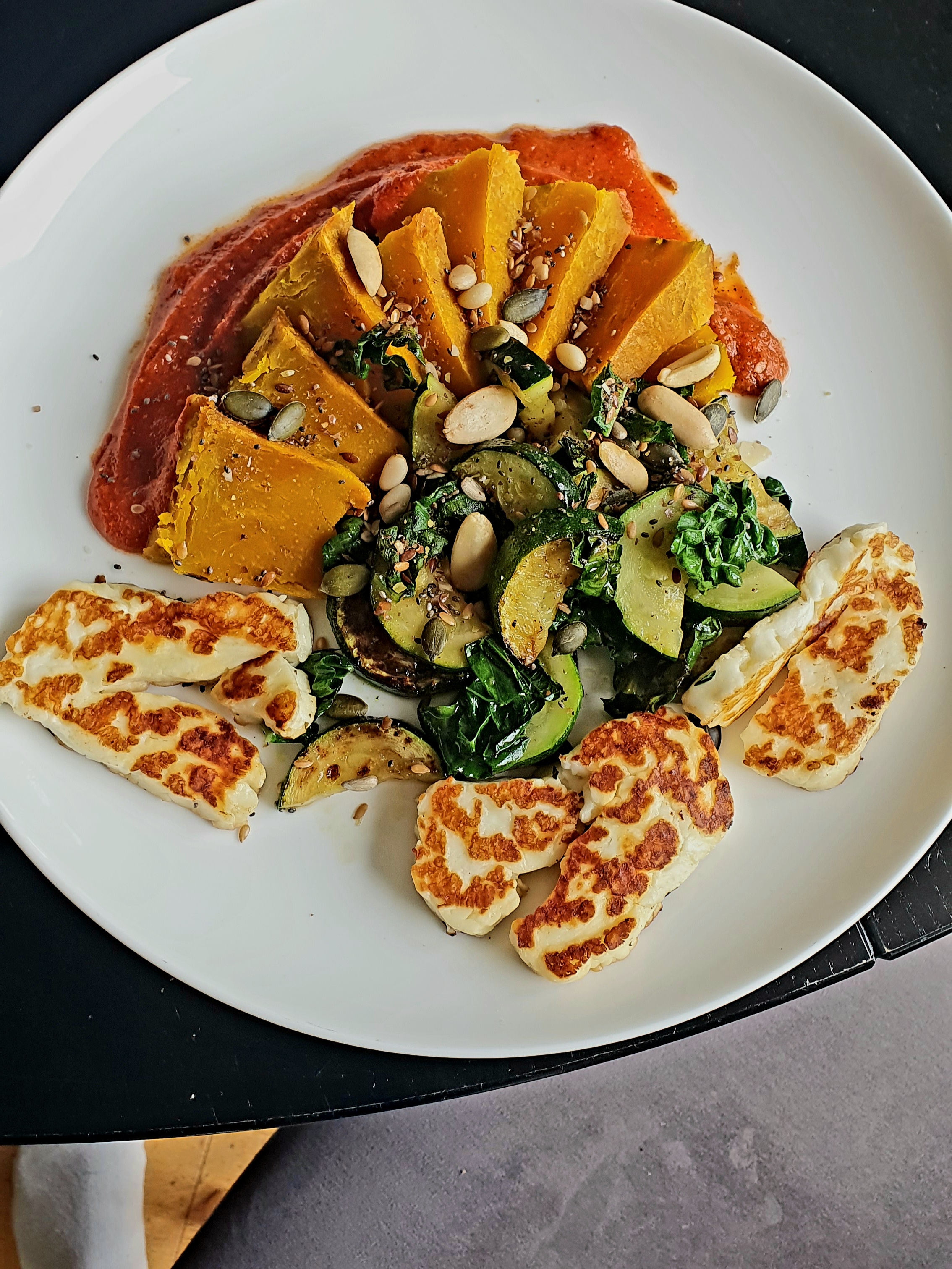 Firstly preheat your over to 180C. Cut your squash in half lengthways and place on a roasting tin, splash with a small amount of olive oil and season as you wish, place in the over for approx 25 mins depending on the size of the squash. Next prepare your vegetables- chop the onion and garlic, slice the courgette into rounds and cut in half, chopr the kale into small pieces. Now heat up a frying pan and add teaspoon of olive oil, gently fry the onions for 5 mins with a pinch of salt and then add garlic and the vegetables and some salt and pepper and stir fry for around 5 mins, you want them to be cooked but still retain a bite. Once done, squeeze over a dash of lemon and leave to the side. Take out your squash and slice into half moons, gently peel or cut off the skin. Now to make the tasty tomato sauce, in a nutribullet or blender tip the tomatoes, garlic powder or fresh garlic clove, herbs, salt, pepper and glug of olive oil, whizz up to taste and then heat gently in a pan until it starts to thicken, I like to add a teaspoon of balsamic whilst it’s thickening. Around 10 mins of simmering will do. Then the final piece of the puzzle is to slice the halloumi (around 8-10 slices) and then dry fry on both sides until golden. Now you are ready to assemble your warm salad. Blob the tomatoe sauce onto the plate artfully and arrange the squash on top, spoon the stir fry veg next to it and then arrange the halloumi. Finally scatter with your nut and seed mix. Tuck in.